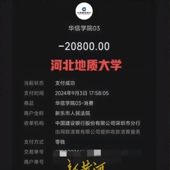 据网传视频中的一张缴费明细单显示,当前状态显示为支付成功,支付金额为20800元,支付时间2024年9月3日,商品一栏显示“华信学院03-消费”,账户全称新乐市人民法院,收单机构为中国建设银行股份有限公司深圳分行。该视频还配文:“新生学费居然直接交给法院?疑似学校一直欠债没有还清。”